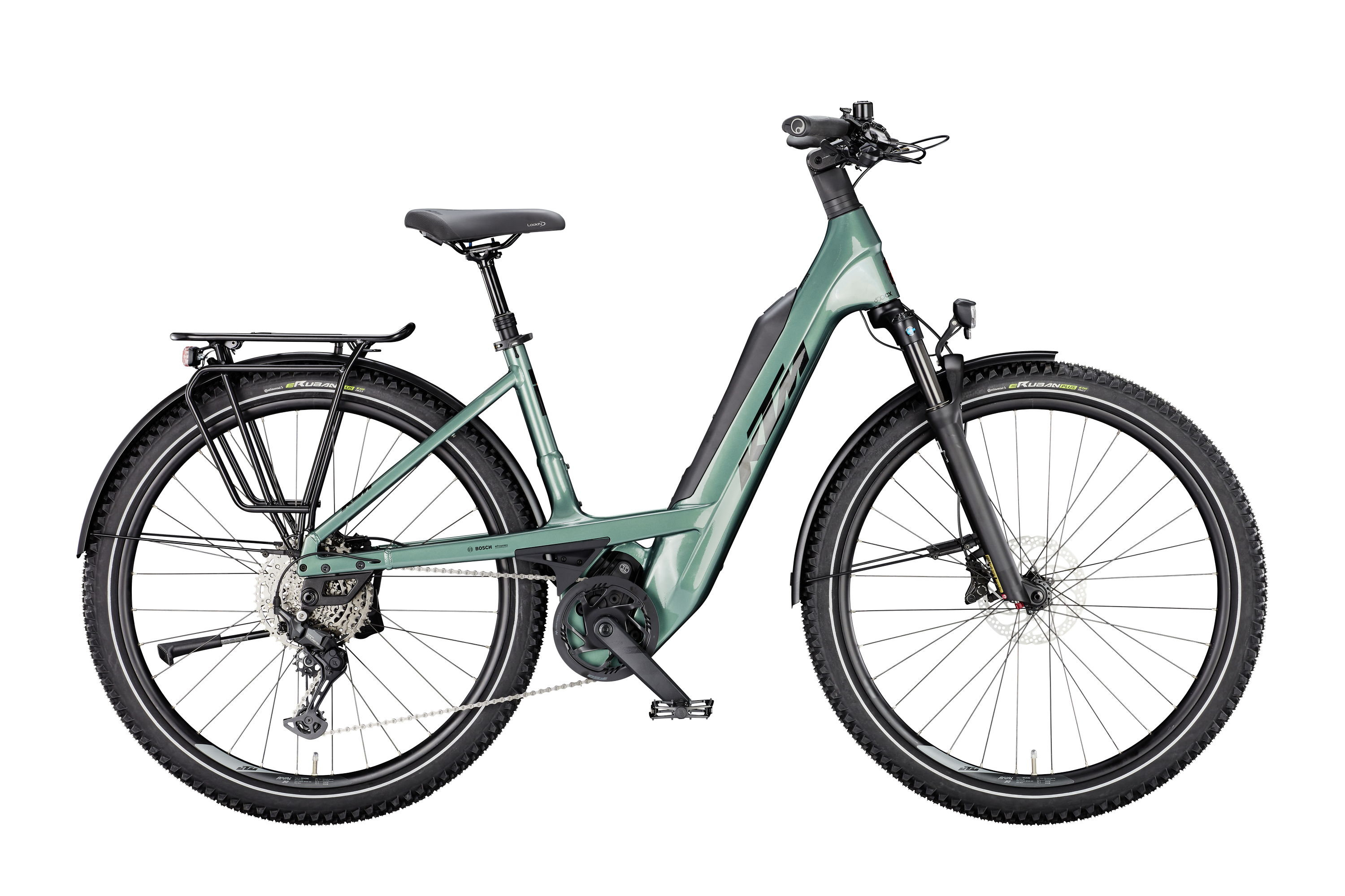 Rama: Macina Trekking On Alloy 6061|PTS800 ABS Bosch BDU38 /T5250 Widelec: Suntour Mobie34-D Air 29" 2CR 80mm 15AH2 Tylna przerzutka: Shimano CUES U6000-11/10 LG shadow+ Manetki: Shimano CUES U6000-10 display Hamulce: Shimano MT402 (3-F) / MT420 4-Piston Tarcze hamulcowe: Shimano RT30 CL 180 Opona przód: Continental E-Ruban Plus 58-622 Reflex Opona tył: Continental E-Ruban Plus 58-622 Reflex Kierownica: Ergotec Lady Town 31,8 690mm Mostek: KTM Line adjust. 0-60° ICR Stery: Acros AICR internal 1.5"-1.5" Chwyty: GRIP ERGON GP10 Siodło: Selle Royal Lookin Evo Sztyca: KTM COMP dropper internal 30.9 T:120 Zacisk: KTM TEAM Light CL-FJ21 - 34,9mm Korba: KTM E-COMP2 ISIS 170mm Q8 Łańcuch: Shimano LG500 Kaseta: Pedały: MTB-Pedal flat VPE-527 alloy Oświetlenie przód: B&M Briq-S 60Lux Oświetlenie tył: B&M Toplight 2C Bagażnik: KTM tour60 snap-it 2.0/monkeyload|childseat + rack clip Podpórka: KTM 28" adjustable MY2025