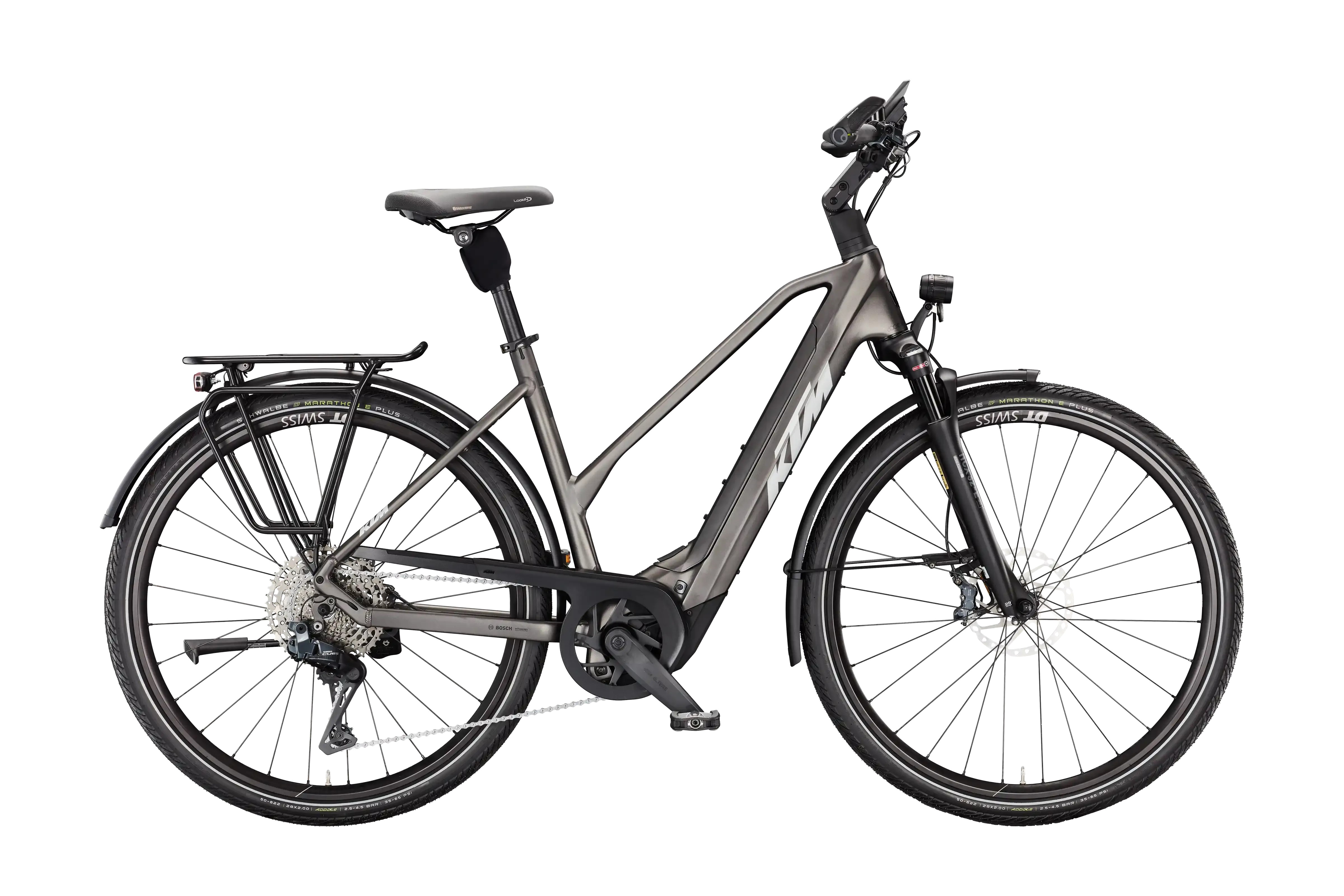 Rama: Macina Trekking Onroad Alloy 6061|PT800 Bosch BDU38/T5940 Widelec: Suntour NCX32-E Air LO 63mm Al 1 1/8 Tylna przerzutka: Shimano Deore XT M8130-11 LG shadow+ Manetki: Shimano Deore XT M8130-11 LG Hamulce: Shimano CUES U8000 / U8020 4-Piston Tarcze hamulcowe: Shimano RT64 CL 180 Koła: DT HU 1900 CL 100/5QR|622x25TC TLR / DT HU 1900 CL 135/5QR|622x25TC SS TLR Opona przód: Schwalbe Green Marathon Perf. GreenGuard 50-622 Opona tył: Schwalbe Green Marathon Perf. GreenGuard 50-622 Kierownica: KTM Line rizer20 640mm Mostek: KTM Line adjust. 0-60° ICR Stery: Acros AICR internal 1.5"-1.5" Chwyty: Ergon GP30 Siodło: Selle Royal Lookin Evo Sztyca: Suntour SP25-NCX suspension 30.9/350 Zacisk: KTM Line JD-SC99 - 34,9mm Korba: KTM E-TEAM2 ISIS 170mm Q8 Łańcuch: KMC e11 Sport EPT e-bike Kaseta: Pedały: Trekking-Pedal VP-616 anti-slip Oświetlenie przód: B&M IQ-XM 120-170Lux HighBeam Oświetlenie tył: B&M Dart brex Bagażnik: KTM tour snap-it 2.0/monkeyload|childseat + rack clip Podpórka: KTM 28" adjustable MY2025