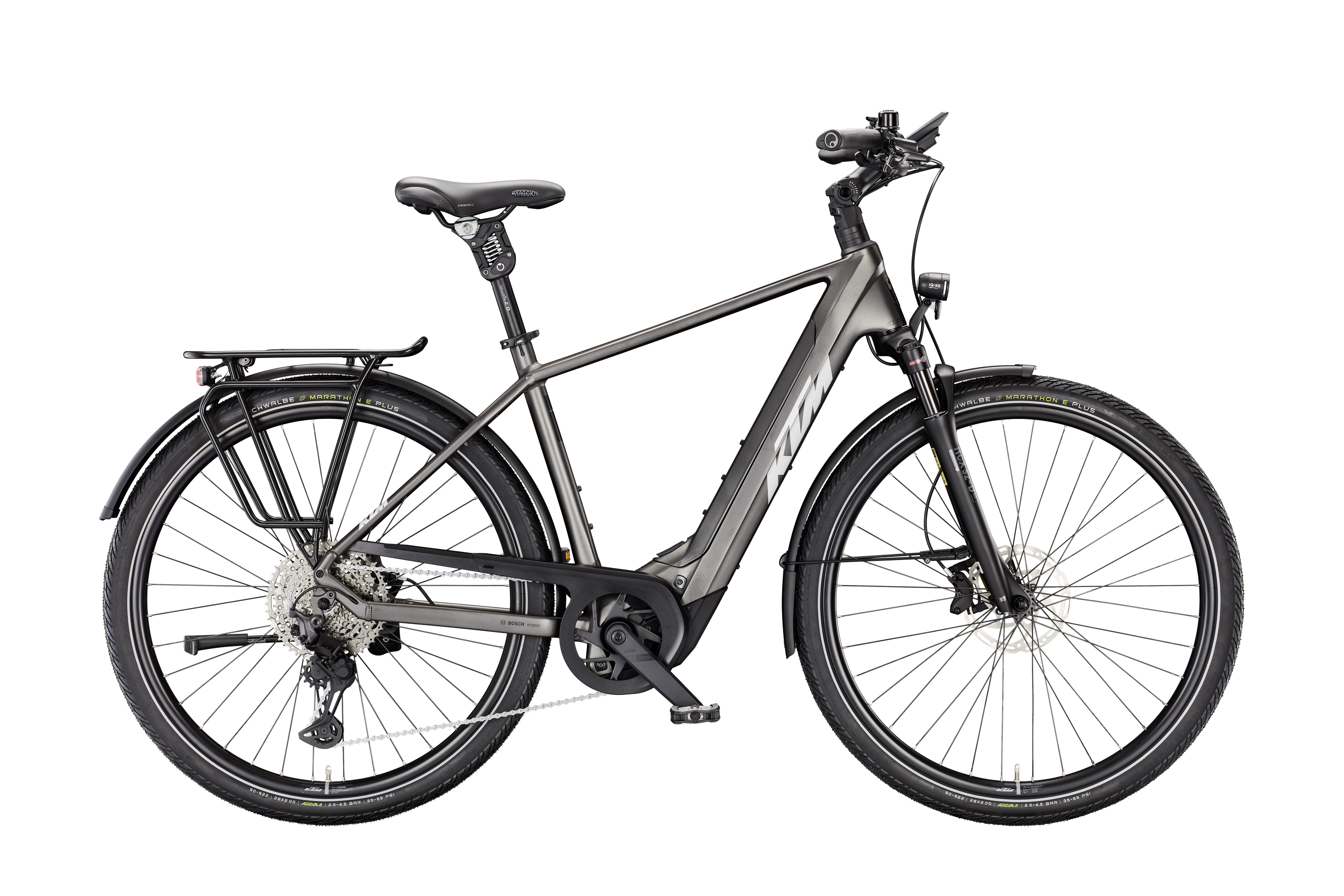 Rama: Macina Trekking Onroad Alloy 6061|PT800 Bosch BDU38/T5940 Widelec: Suntour NCX32-D coil LO 63mm (HD) 1 1/8 Tylna przerzutka: Shimano Deore XT M8130-11 LG shadow+ Manetki: Shimano Deore XT M8130-11 LG Hamulce: Tektro TKD-139 / HD-E730 4-Piston Tarcze hamulcowe: Tektro TR-45 2.3mm CL 180 Opona przód: Schwalbe Marathon E-Plus Perf. DualGuard 50-622 Reflex Opona tył: Schwalbe Marathon E-Plus Perf. DualGuard 50-622 Reflex Kierownica: Ergotec Lady Town 31,8 690mm Mostek: Ergotec Swell RE70i adjust. 0-60° Stery: Acros AICR intern 1.1/8"-1.5" angle lim Chwyty: GRIP ERGON GP10 Siodło: Selle Royal Viaggio Sztyca: bySchulz G.2 ST suspension 30.9/350 Zacisk: KTM Line JD-SC99 - 34,9mm Korba: KTM E-COMP2 ISIS 170mm Q8 Łańcuch: KMC e11 Sport EPT e-bike Kaseta: Pedały: Trekking-Pedal VP-616 anti-slip Oświetlenie przód: B&M IQ-XS 80Lux Oświetlenie tył: B&M Toplight 2C Bagażnik: KTM tour snap-it 2.0/monkeyload|childseat + rack clip Podpórka: KTM 28" adjustable MY2025