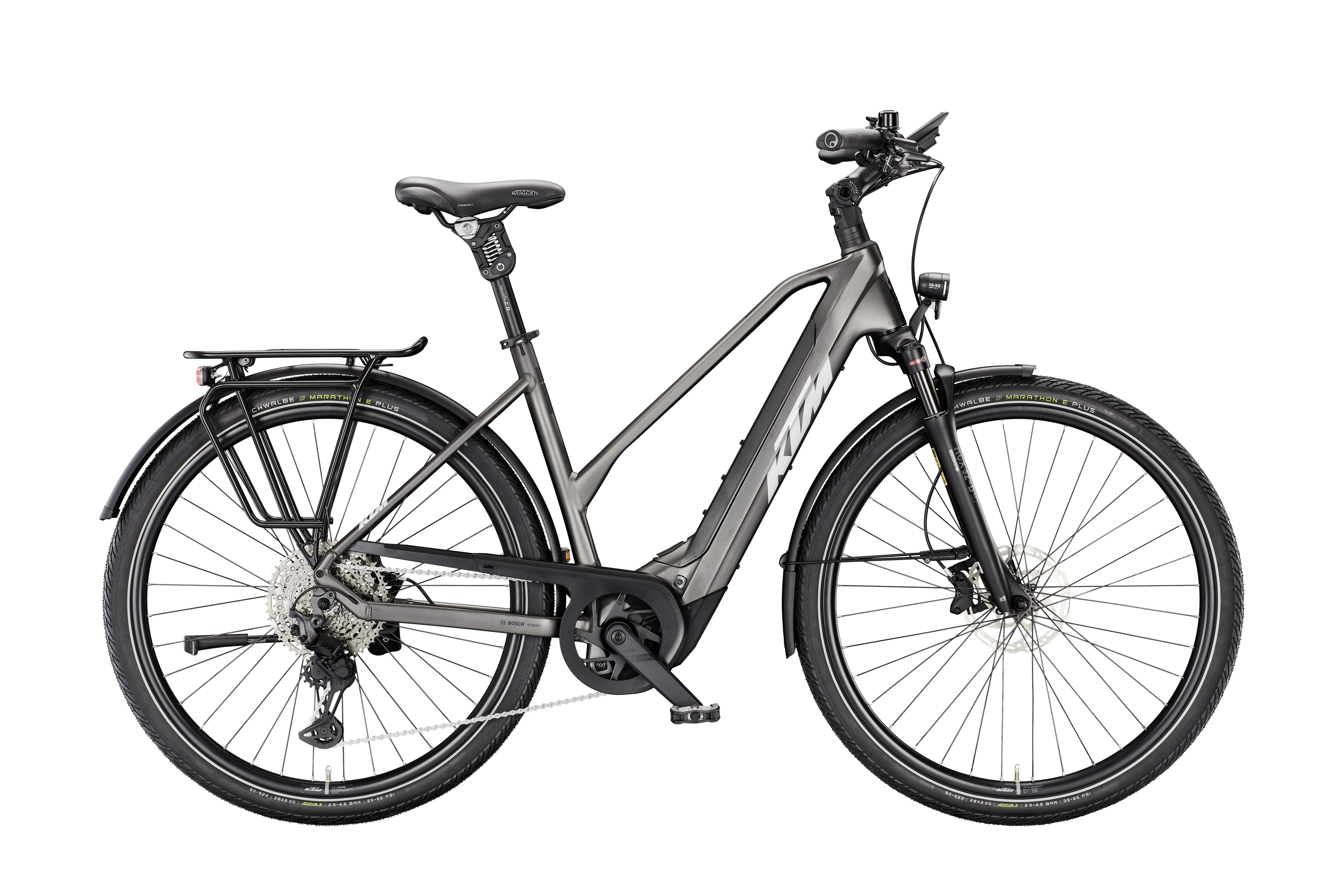 Rama: Macina Trekking Onroad Alloy 6061|PT800 Bosch BDU38/T5940 Widelec: Suntour NCX32-D coil LO 63mm (HD) 1 1/8 Tylna przerzutka: Shimano Deore XT M8130-11 LG shadow+ Manetki: Shimano Deore XT M8130-11 LG Hamulce: Tektro TKD-139 / HD-E730 4-Piston Tarcze hamulcowe: Tektro TR-45 2.3mm CL 180 Opona przód: Schwalbe Marathon E-Plus Perf. DualGuard 50-622 Reflex Opona tył: Schwalbe Marathon E-Plus Perf. DualGuard 50-622 Reflex Kierownica: Ergotec Lady Town 31,8 690mm Mostek: Ergotec Swell RE70i adjust. 0-60° Stery: Acros AICR intern 1.1/8"-1.5" angle lim Chwyty: GRIP ERGON GP10 Siodło: Selle Royal Viaggio Sztyca: bySchulz G.2 ST suspension 30.9/350 Zacisk: KTM Line JD-SC99 - 34,9mm Korba: KTM E-COMP2 ISIS 170mm Q8 Łańcuch: KMC e11 Sport EPT e-bike Kaseta: Pedały: Trekking-Pedal VP-616 anti-slip Oświetlenie przód: B&M IQ-XS 80Lux Oświetlenie tył: B&M Toplight 2C Bagażnik: KTM tour snap-it 2.0/monkeyload|childseat + rack clip Podpórka: KTM 28" adjustable MY2025